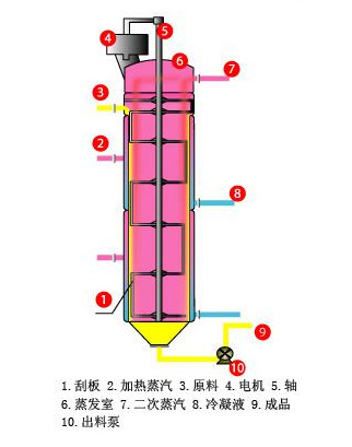 在濃縮過程液層很薄,溶液沸點升高可忽略,料液在加熱區(qū)域停留時間,隨濃縮器的高度(長度)和刮板的導向角、轉(zhuǎn)速等因素而變化,一般在2秒~45秒左右。