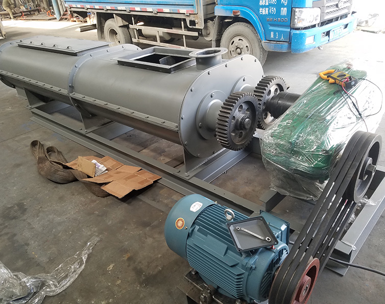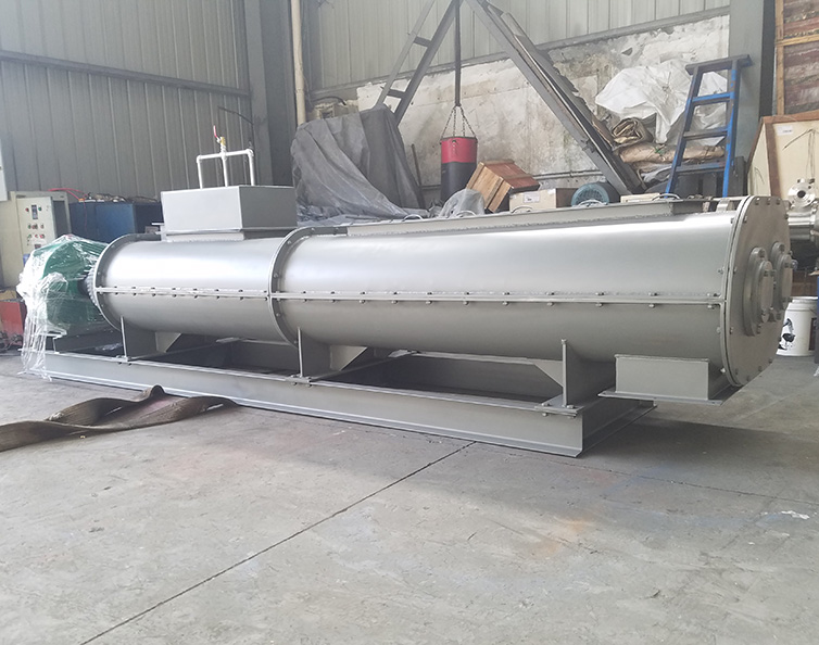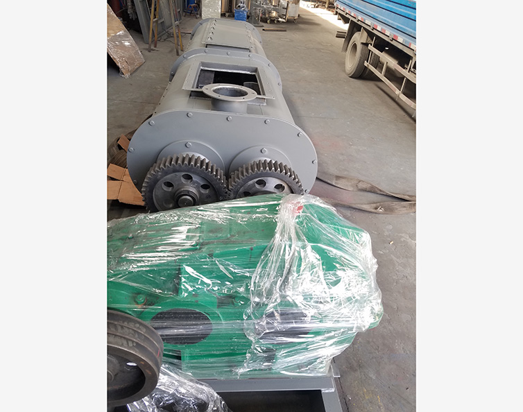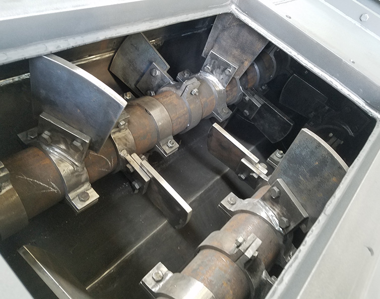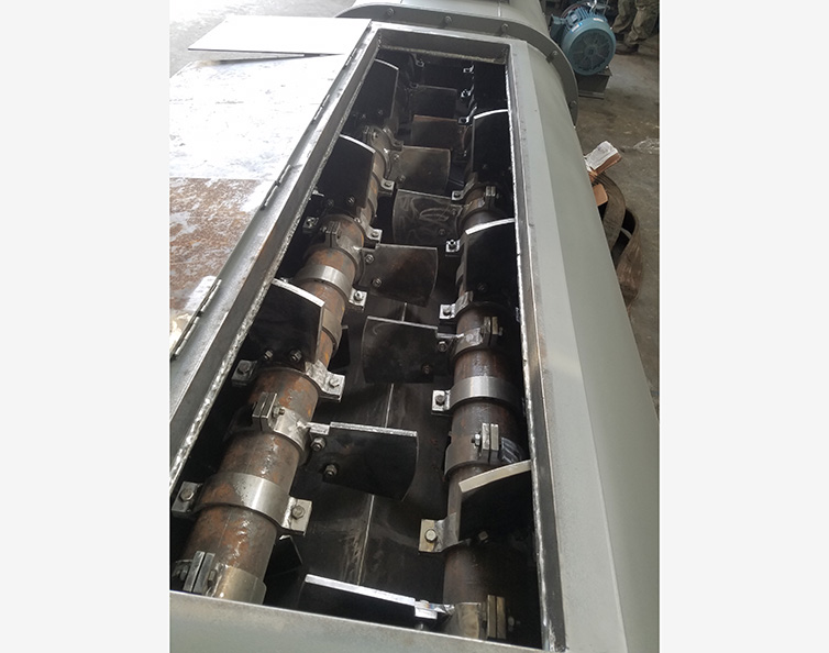 臥式雙軸混合機由臥式W形容器、帶(或者不帶)開口的頂蓋、安裝有槳葉并反向旋轉(zhuǎn)的雙軸、傳動單元、支撐架、密封件、出料結(jié)構(gòu)等部件組成。由于雙軸反向旋轉(zhuǎn),成一定角度的漿葉將物料沿軸向、徑向循環(huán)翻攪,使物料達到均勻混合的效果。物料在混合器內(nèi)的上拋運動形成流動層,產(chǎn)生瞬間失重。從而達到剪切、混合的效果。