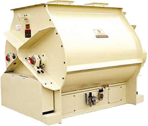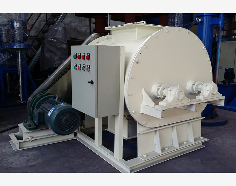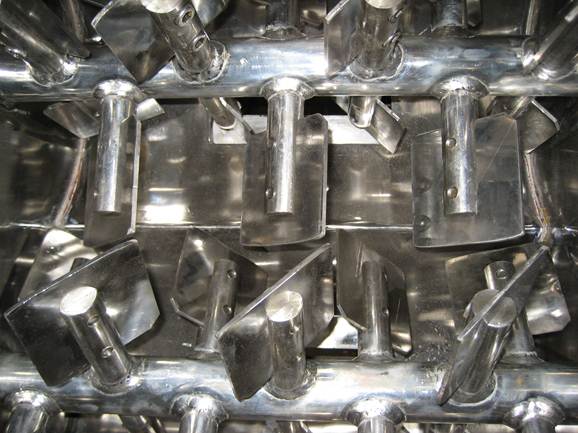 該機在w形的混合室內(nèi)裝有一對以相反方向旋轉(zhuǎn)的軸,在每個軸上安裝具有一定角度、一定數(shù)量且呈重疊狀的槳葉,在具有一定圓周速度的混合室內(nèi)形成流動層,層內(nèi)的物料在對流混合原理的作用下進行混合,并在瞬間處于失重狀態(tài),因而得到均勻混合物。 在容器上方亦可裝有噴液口,進行噴加液體的固-液混合。
