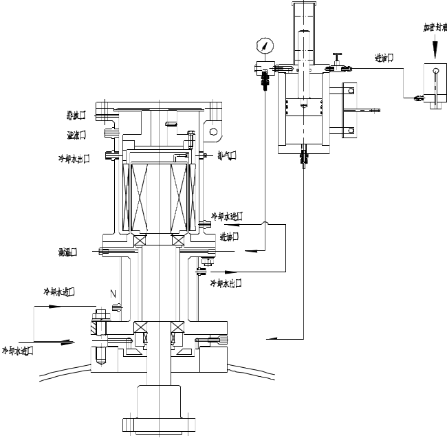 1、在密封隔離套內(nèi)的軸承下端設置一套專有技術(shù)的機械密封系統(tǒng),將軸承完全密封在稀油潤滑油腔中,外接特制的壓力平衡、補油系統(tǒng)。