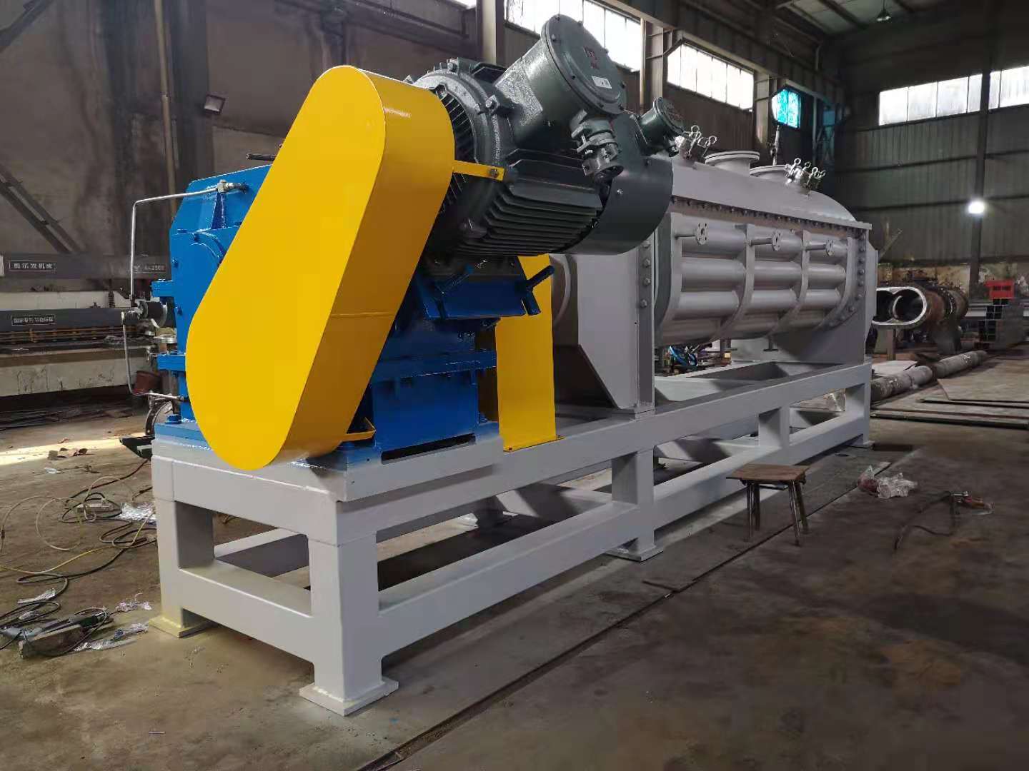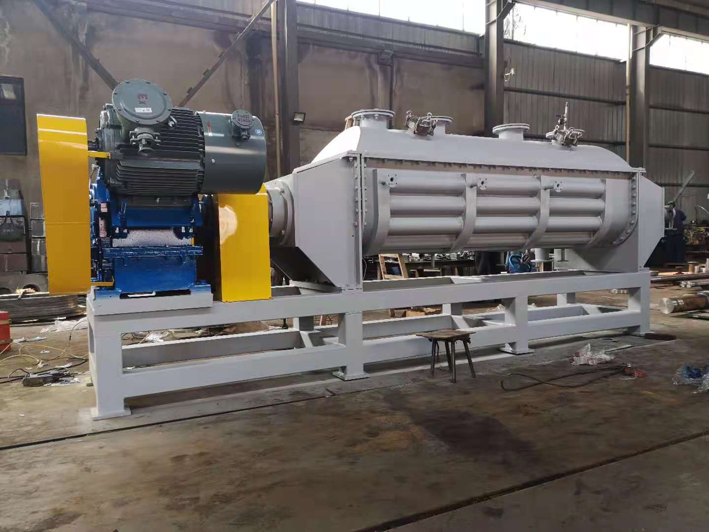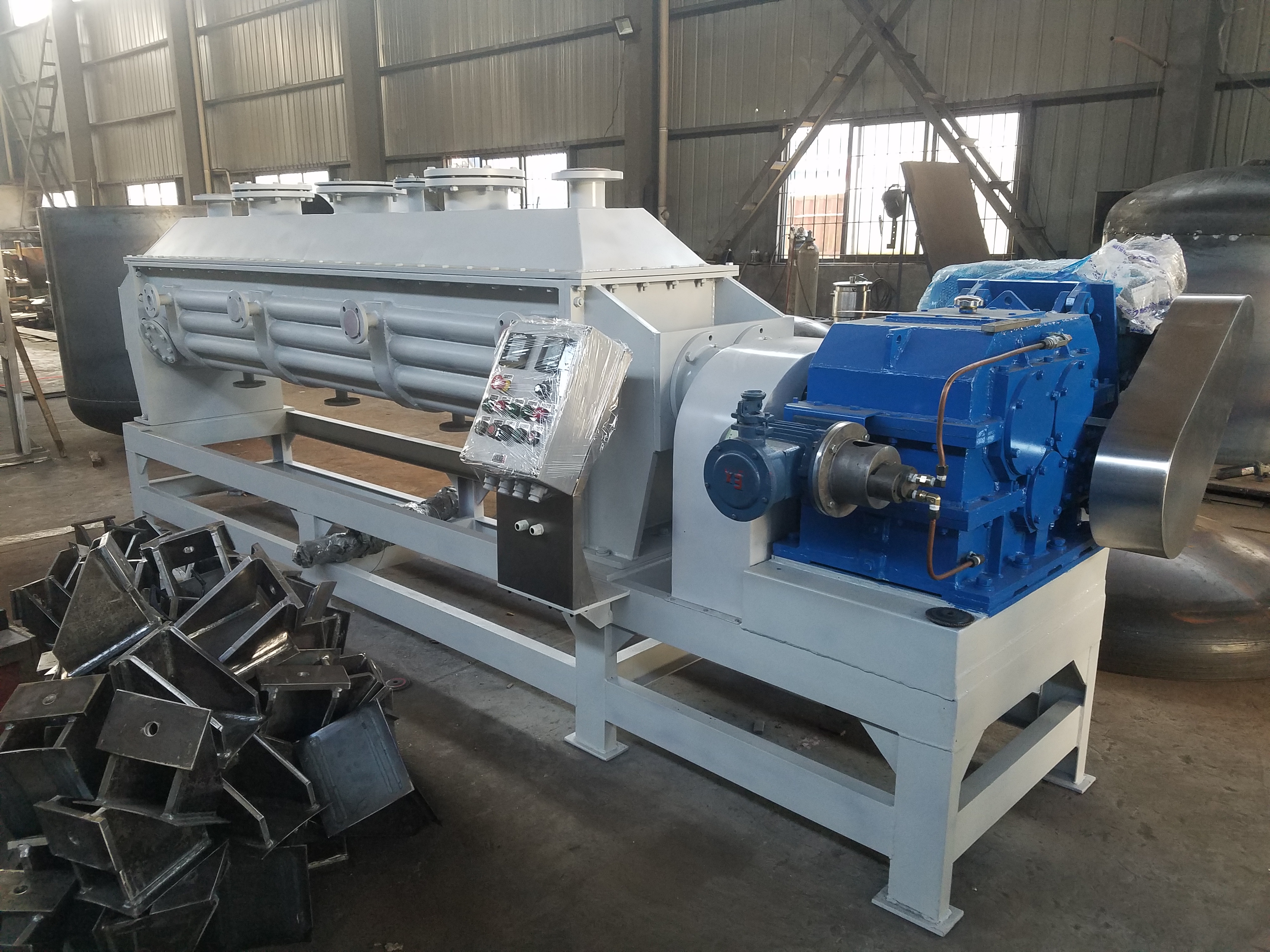 .混合機(jī)除夾套有傳熱功能,其主要的傳熱單元還是攪拌軸和攪拌盤,攪拌軸和槳盤中間設(shè)計(jì)是空心的,能通入0-300℃?zhèn)鳠峤橘|(zhì)循環(huán),加上攪拌軸的旋轉(zhuǎn),單位時(shí)間內(nèi)物料接觸換熱面積增加,使該混合設(shè)備具有高效的傳熱能力.是高粘流體物料反應(yīng),蒸發(fā),干燥,脫輝的首選裝置。
