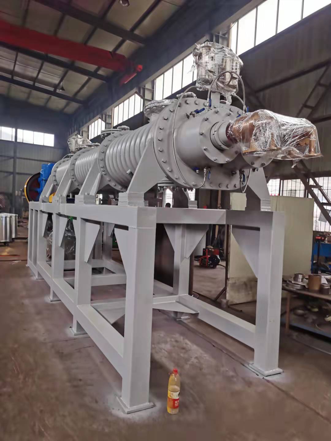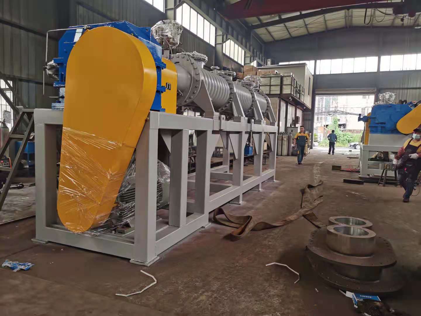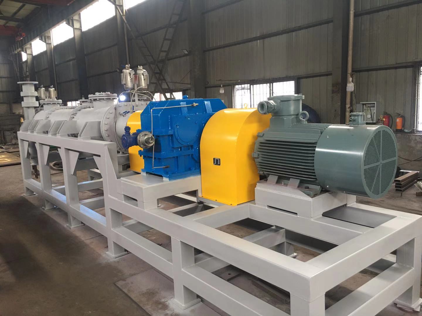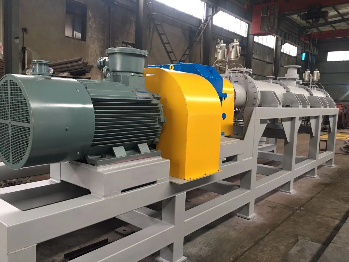 .混合機(jī)除夾套有傳熱功能,其主要的傳熱單元還是攪拌軸和攪拌盤,攪拌軸和槳盤中間設(shè)計(jì)是空心的,能通入0-300℃?zhèn)鳠峤橘|(zhì)循環(huán),加上攪拌軸的旋轉(zhuǎn),單位時(shí)間內(nèi)物料接觸換熱面積增加,使該混合設(shè)備具有高效的傳熱能力.是高粘流體物料反應(yīng),蒸發(fā),干燥,脫輝的首選裝置。