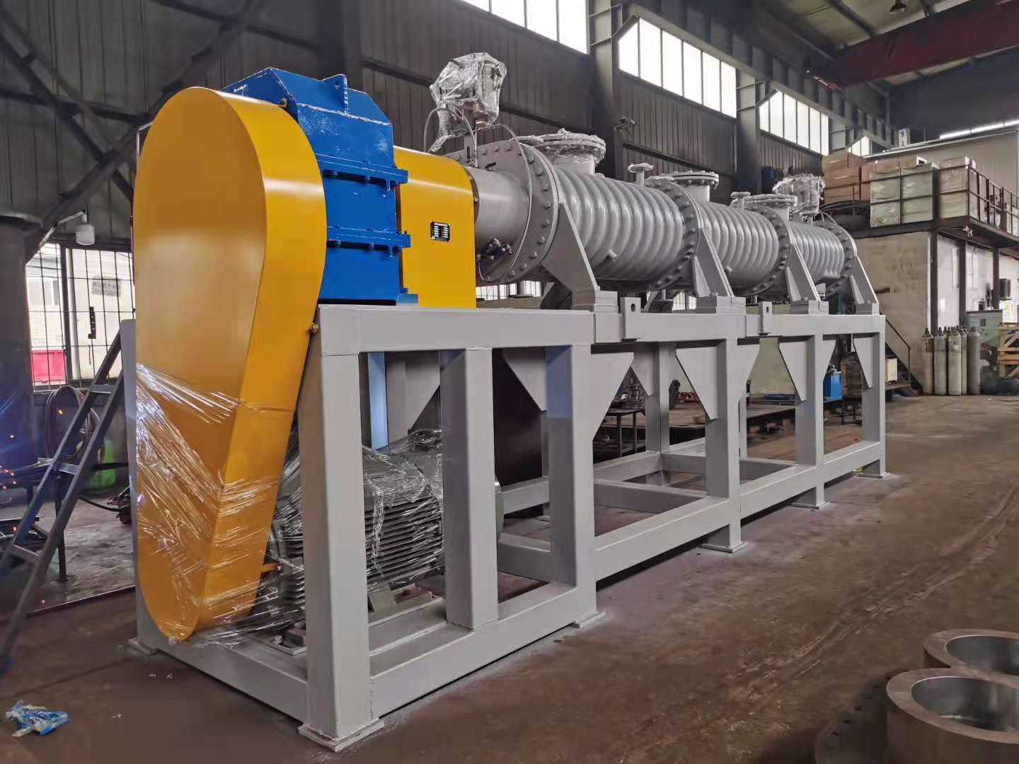 為了盡量增大單位設(shè)備容積的傳熱面積,WZS型自清潔脫揮器的殼體、攪拌軸和攪拌槳都通有導(dǎo)熱介質(zhì)。強(qiáng)力的混合和捏合作用能有效地使物料更快地表面更新,該作用與具有自清潔功能的傳熱面相結(jié)合,從而確保熱、質(zhì)傳遞所需的高表面更新速率。