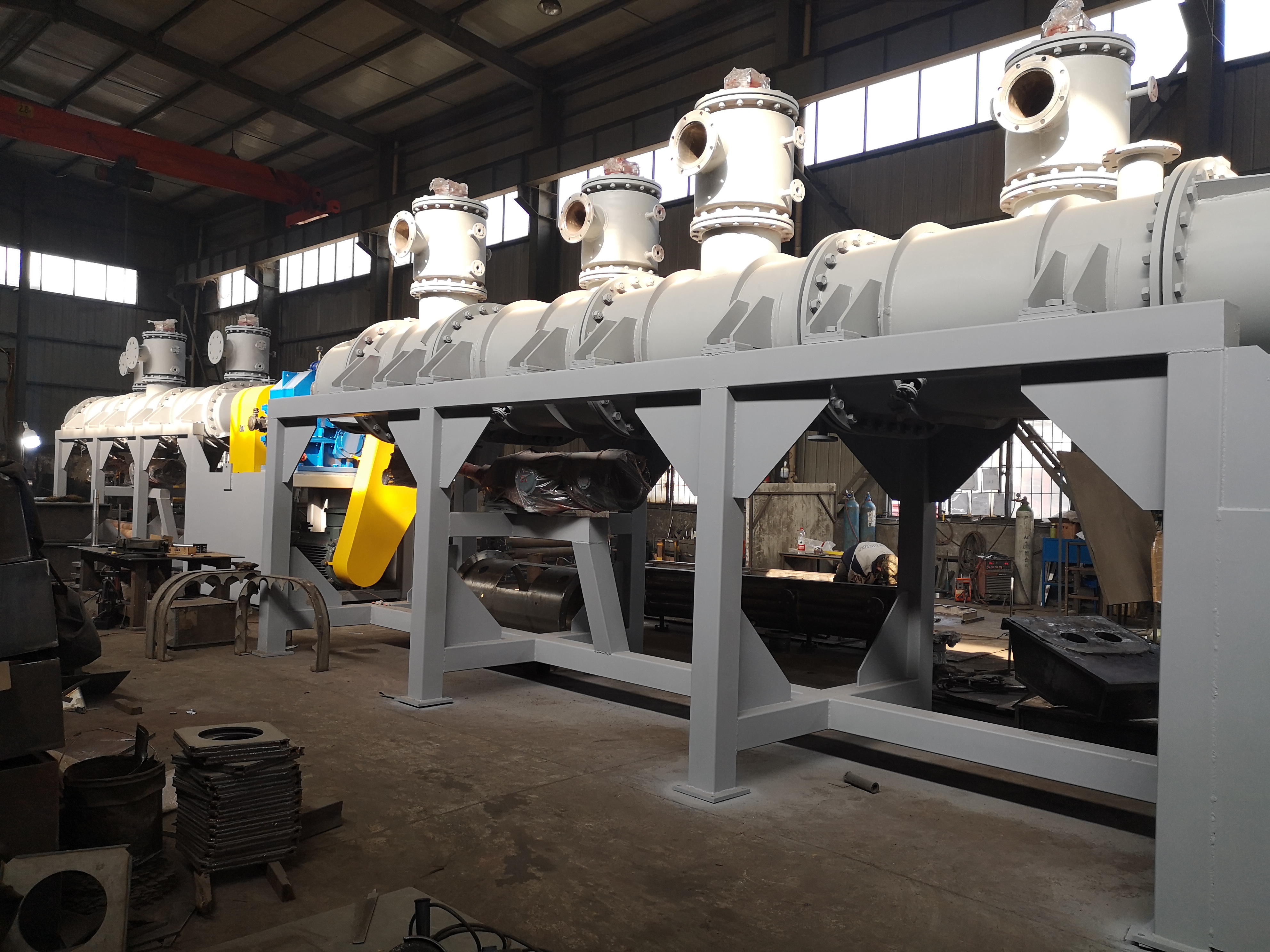 為了盡量增大單位設(shè)備容積的傳熱面積,WZS型自清潔脫揮器的殼體、攪拌軸和攪拌槳都通有導(dǎo)熱介質(zhì)。強(qiáng)力的混合和捏合作用能有效地使物料更快地表面更新,該作用與具有自清潔功能的傳熱面相結(jié)合,從而確保熱、質(zhì)傳遞所需的高表面更新速率。