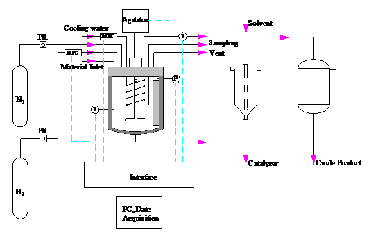 全套催化加氫模試系統(tǒng)設計壓力6.4Mpa、溫度200°C,主要由24L的主反應器系統(tǒng)、PLC控制系統(tǒng)、催化劑過濾回收系統(tǒng)等組成。其工作流程為:反應開始前,把原料、溶劑、催化劑混合后抽入釜內(nèi),釜內(nèi)的空氣經(jīng)氮氣置換后,往釜內(nèi)通入經(jīng)氫氣質(zhì)量流量計計量后的氫氣,通過導熱油加熱使釜溫上升,當釜內(nèi)壓力和溫度達到設定值時,啟動攪拌電機開始反應。反應開始后,停導熱油加熱,開冷卻水冷卻,冷卻水量由水質(zhì)量流量計進行準確計量。通過控制氫氣管路和冷卻水管路上的氣動調(diào)節(jié)閥開度使反應在恒壓恒溫下進行。反應過程中,通過精細設計的取樣管路可在帶壓下取得不含催化劑的液相樣品。反應結(jié)束后,通過釜內(nèi)余壓使釜內(nèi)料液經(jīng)過催化劑過濾器,被過濾器攔截下來的催化劑通過溶劑洗滌后回收利用,反應產(chǎn)物和溶劑則進入產(chǎn)品儲罐進行進一步的分離、提純。